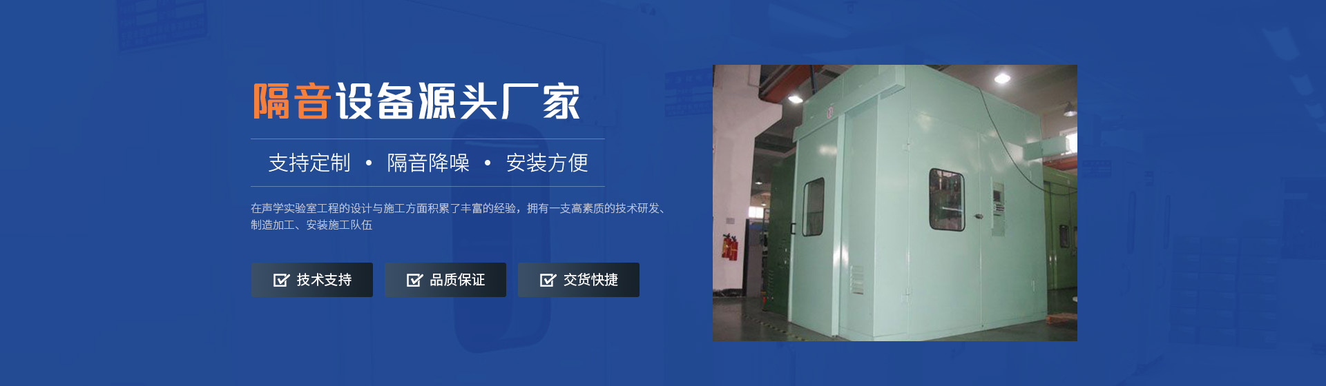 林昇環(huán)保在聲學(xué)實(shí)驗(yàn)室工程的設(shè)計(jì)與施工方面積累了豐富的經(jīng)驗(yàn),擁有一支高素質(zhì)的技術(shù)研發(fā)、制造加工、安裝施工隊(duì)伍。提供現(xiàn)場(chǎng)測(cè)量踏勘、噪聲數(shù)據(jù)分析、方案設(shè)計(jì)、生產(chǎn)加工、施工安裝、儀器設(shè)備等一系列全方位服務(wù)。